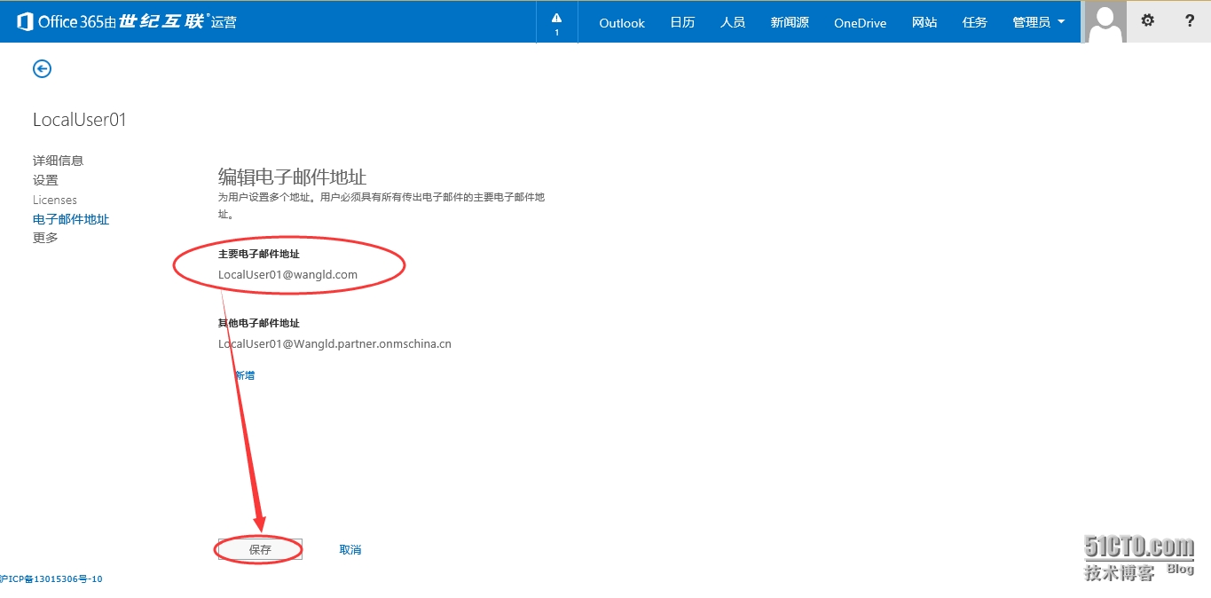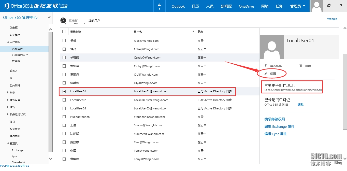 5.5 分配许可和电子邮件地址后,发现地址并非是Wangld.com,而是默认的域名,此时想到通过点击编辑按钮进行修改,点击“编辑”