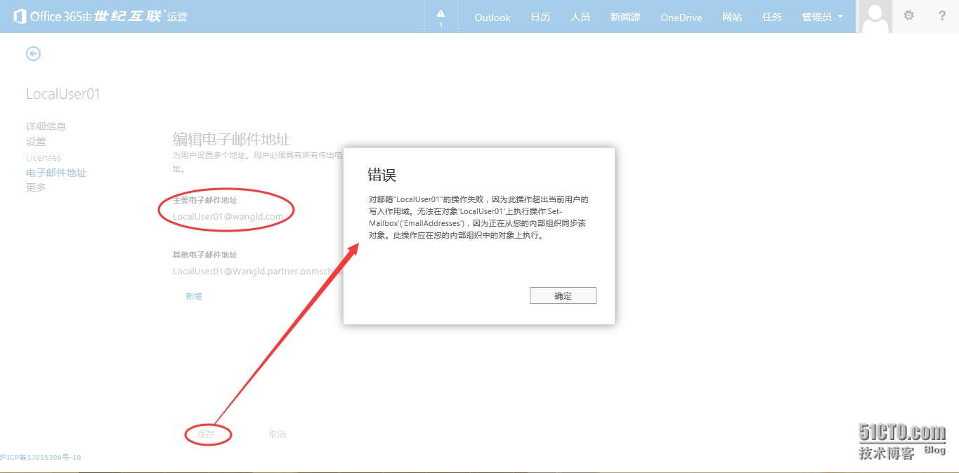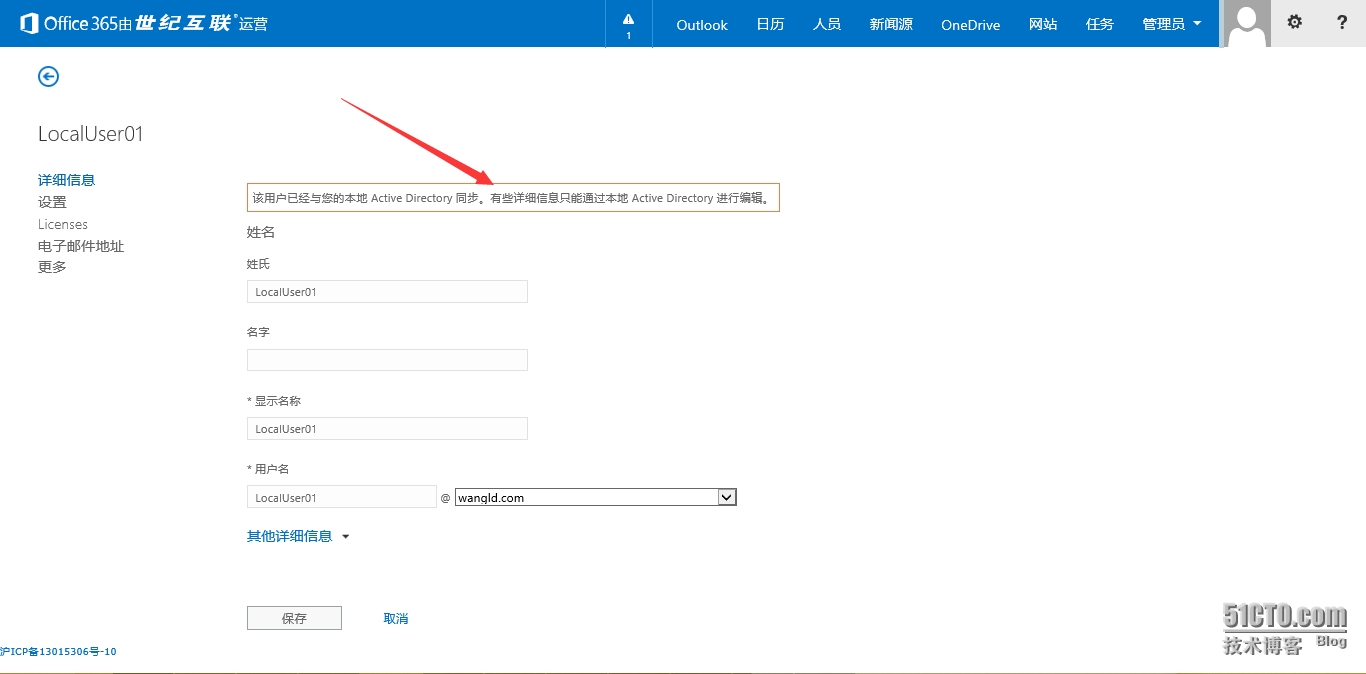 5.9 保存后出现错误,说明只能通过本地AD修改后再同步过来。当然此时可能会有人说,刚才配置的时候不是勾选了“启用混合部署”吗。勾选此“启用混合部署”的作用是将Office365云端的用户部分属性同步到本地AD,并不是可以实现在云端进行编辑更改用户属性。