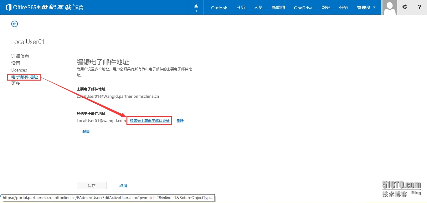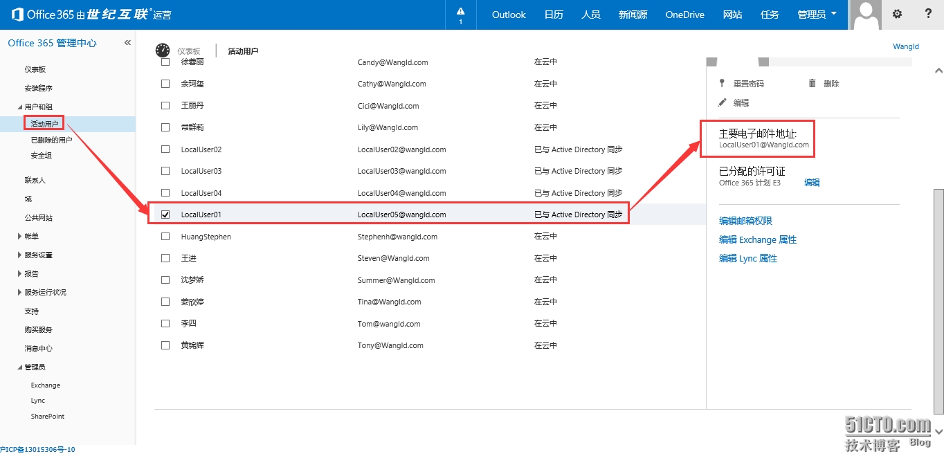 5.11 等待同步完成后,回到O365管理中心可发现主要电子邮件地址已经更改过来了,如图