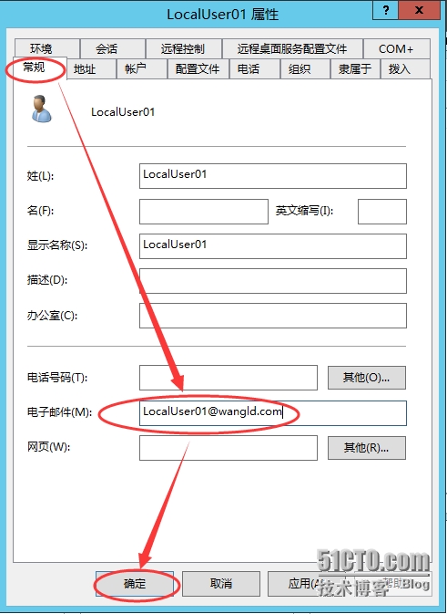 5.10 回到本地active directory 用户和计算机,编辑用户LocalUser01属性,在电子邮件地址处输入LocalUser01@Wangld.com,点击确定。