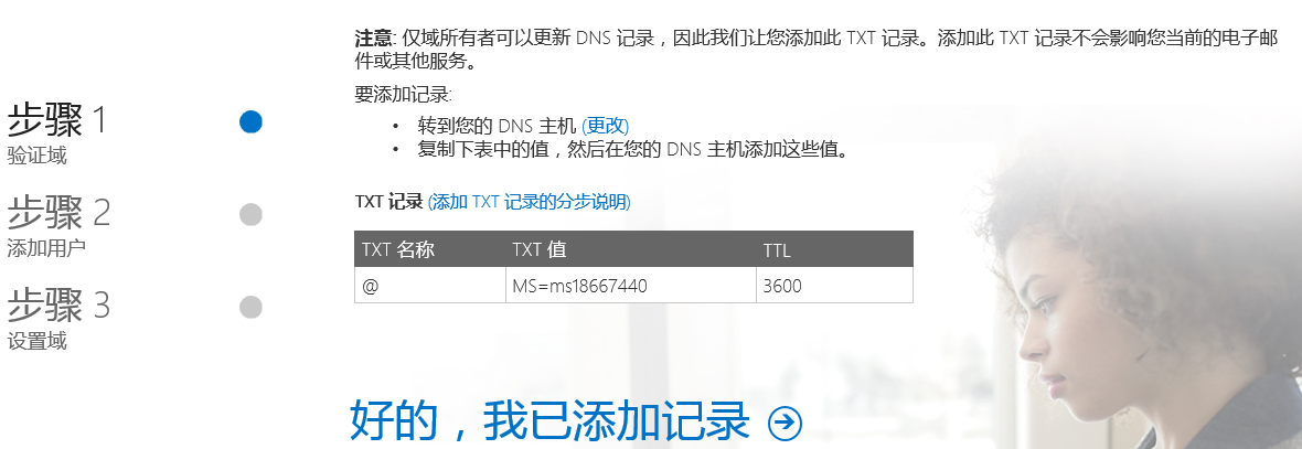 在添加域页面中,根据添加向导进行,输入域名称contoso.com。接下来Office 365需要我们在公网DNS服务器中新建一条TXT记录,此条记录主要是为了验证域名所有权。