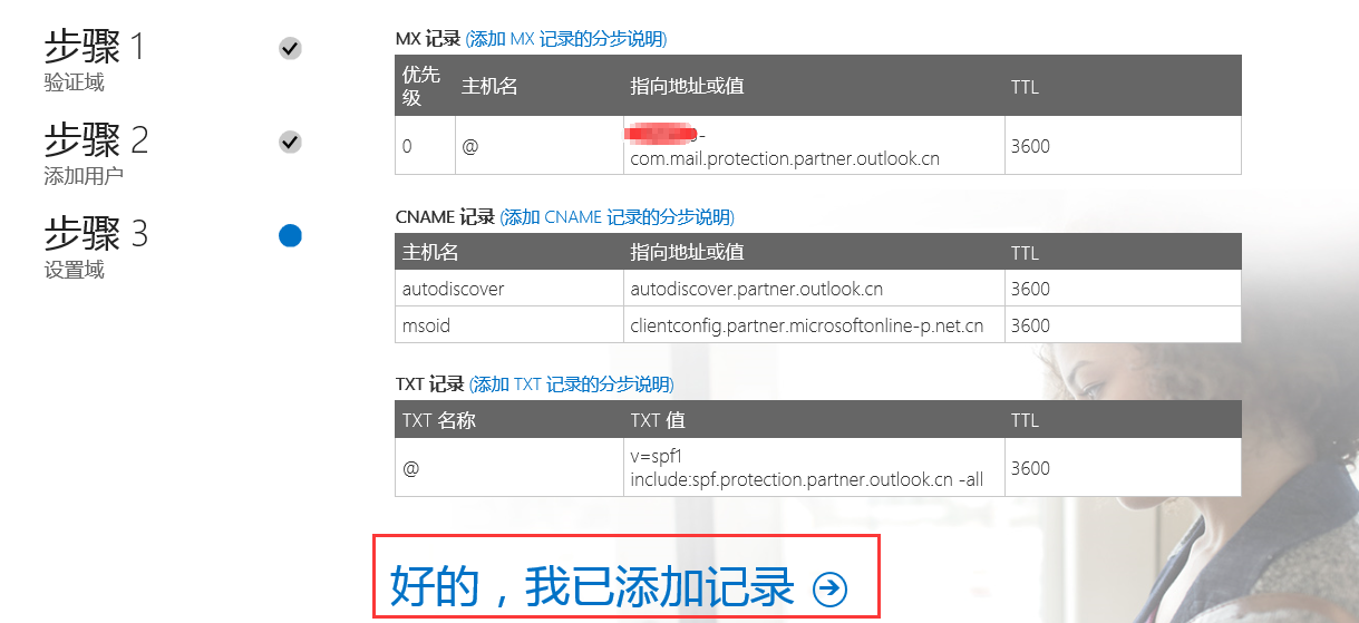 1. CNAME 主机名:mail 指向地址:partner.outlook.cn (这条记录主要应用于用户访问Office 365更佳方便)