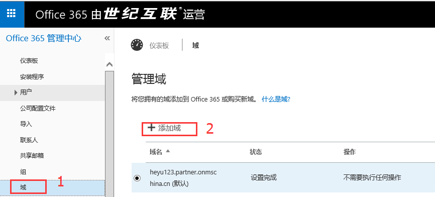 使用管理员登录到Office 365管理中心后在域中添加一个新域