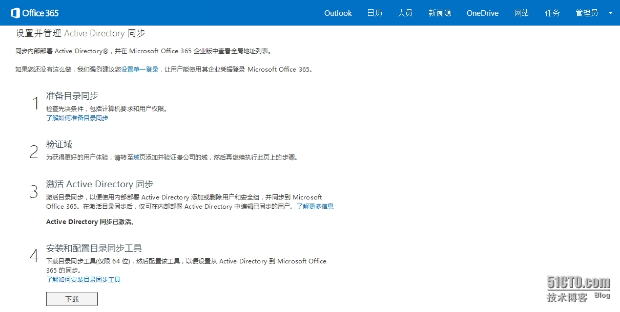 手动同步自不用说,通过CSV文件创建下一节中会讲到,现在我们来看如何通过活动目录同步工具DirSync来统一将域内的用户同步和OU等信息过来。首先要确定的是这是一个单向的同步,也就是只能从本地的AD同步到Office 365中,同步到Office 365中后我们可以在本地AD中进行正常的用户管理,这些更改都将会同步到Office 365中,但是在Office 365中的更改并不会同步到本地AD,因此这是一个单向的同步。据说下一代的支持双向同步的产品已经出来了,不过暂时还没见到