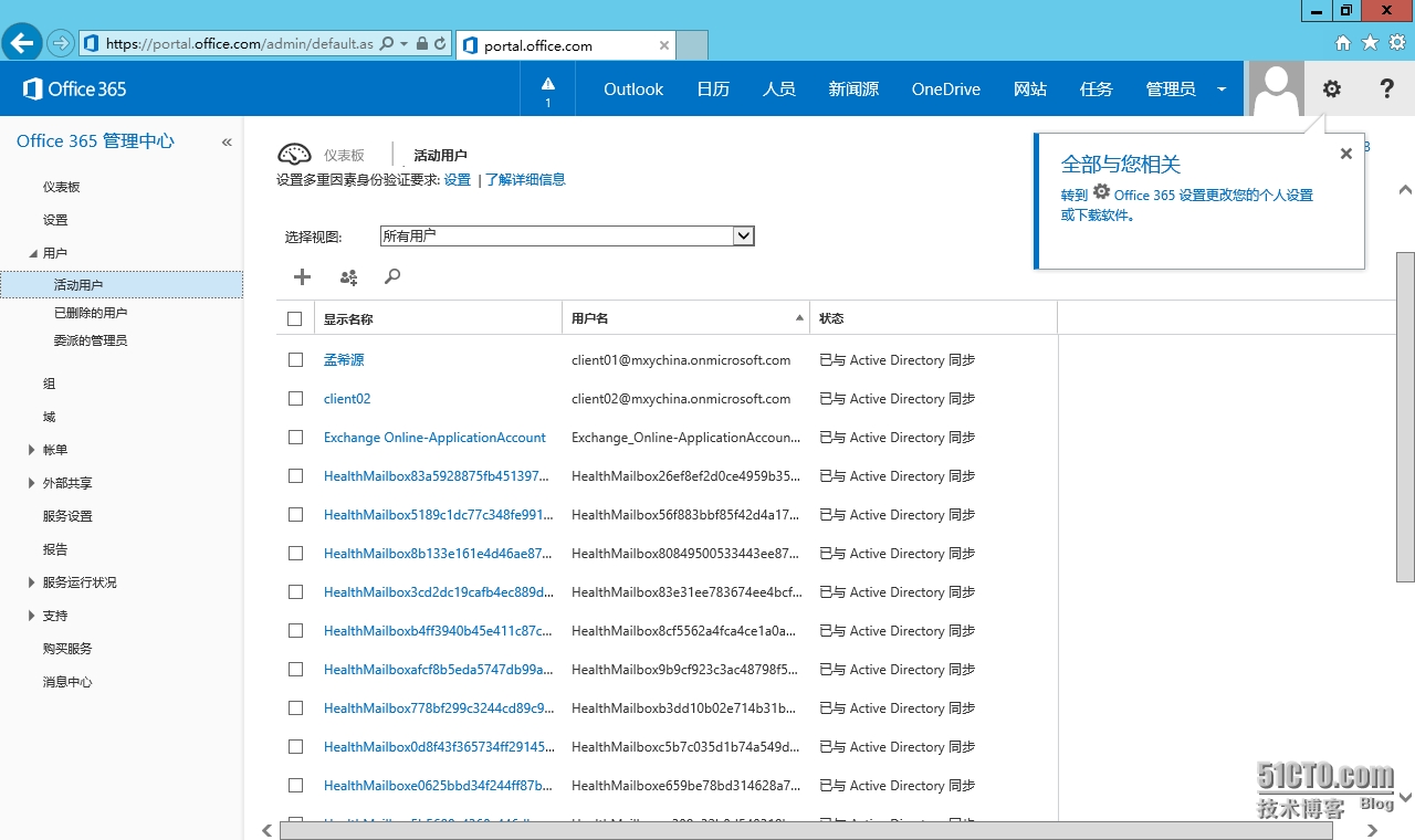 16.等待一段时间后,可以在Office 365管理界面看到这些同步过来的账户