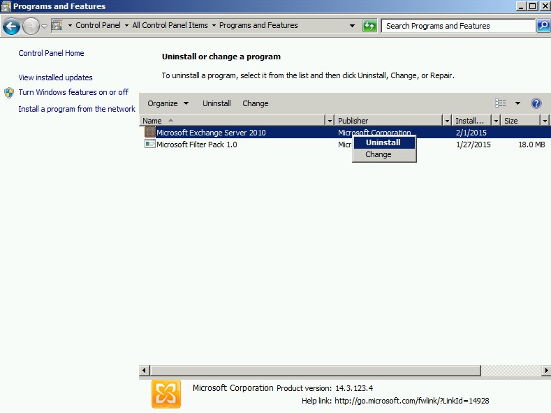 - 右键点击”Microsoft Exchange Server 2010”选择”卸载”