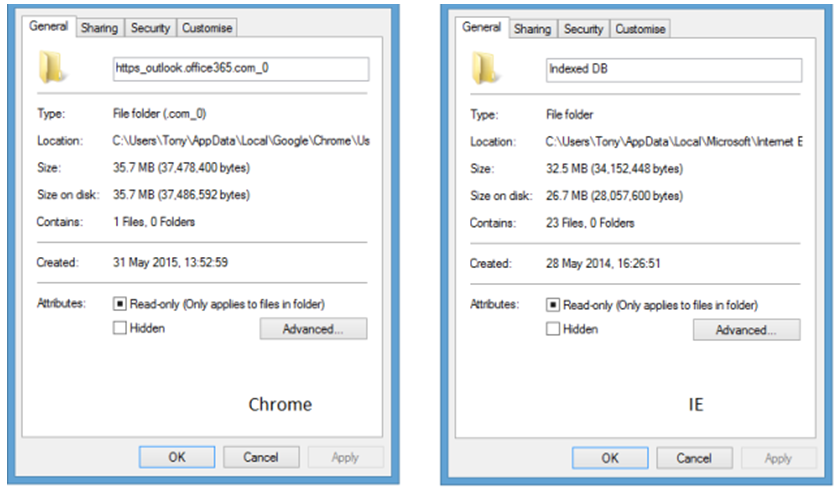不同的浏览器会以不同的方式缓存用户的邮箱。在微软的Surface上,IE浏览器使用ESE数据库,例如Exchange,但和传统的ESE数据库不同,因为它所使用的数据库(Internet.edb)支持HTML5标准,数据库大小为22,592KB。Chrome浏览器将用户数据缓存在WebSQL的数据库中,大小为36,696KB。在启用离线访问后,您可以定制任务在邮箱数据相对静态的时候(比如说礼拜天下午)让浏览器去下载新的邮件。当然,缓存的数据必须被保护起来,不然一旦用户的PC被非法登陆,入侵者就会截取到邮件数据,Bitlocker是数据保护的一个不错的软件。