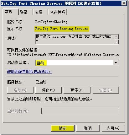 重启之后,打开服务管理器,找到【Net.Tcp Port Sharing Service】服务,在服务属性中将启动类型修改为【自动】