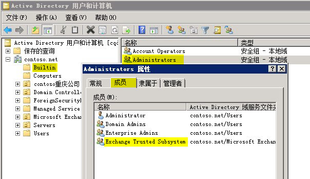 在创建DAG之前,我们要先规划好用谁来做为DAG的见证服务器,见证服务器作用是协调DAG节点间的故障转移 ,也就是说,当一台节点发生故障后,由见证服务器来决定谁来继续接管服务,本例中我们将用域控制器来作为见证服务器,由于域控制器为非Exchange服务器,所以首先要将Exchange可信子系统组加入到域控制器的本地管理员组中