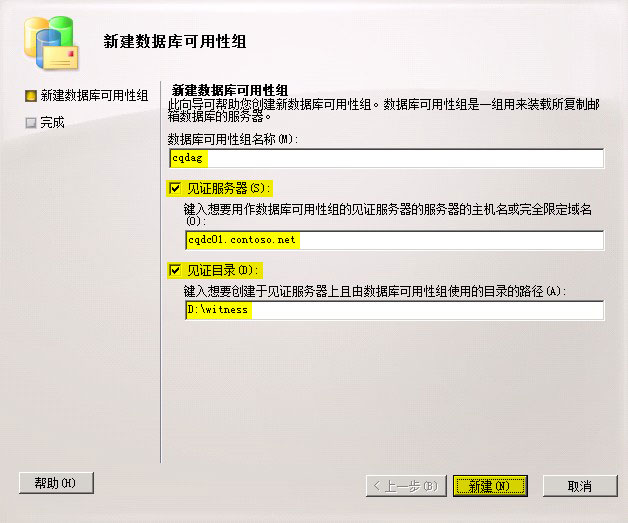 如图指定DAG的名称、见证服务器以即见证目录