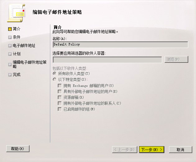 接着来配置电子邮件地址转换,切换到【电子邮件地址策略】选项卡,在本环境中我希望所有的用户都使用@excontoso.tk做为邮件后缀名,那么这里只需要编辑默认策略即可,当然也可以新建策略