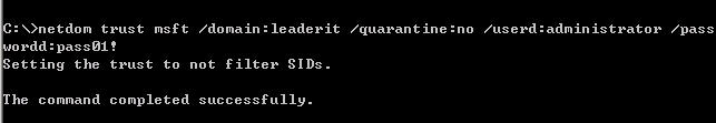 netdom trust leaderit /domain:msft /quarantine:no /userd:administrator /passwordd:pass01!