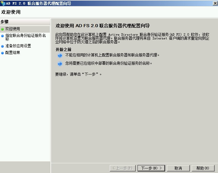 - 在安装完成后,打开ADFS2.0联合服务器代理配置向导,在欢迎使用中点击下一步
