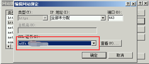- 将之前申请的公网证书导入到ADFS代理服务器后,在编辑网站绑定中选择SSL证书为ADFS.contoso.com之后确定