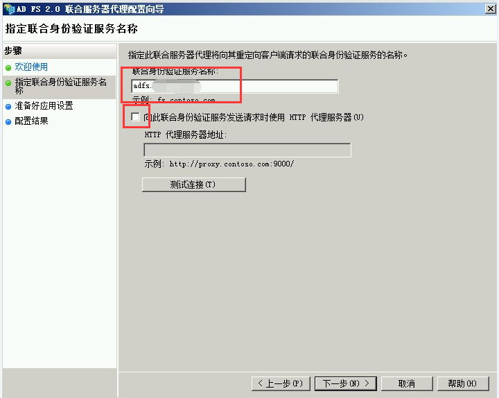 - 在指定联合身份验证服务器名称页面中,指定ADFS.contoso.com并勾选向此联合身份验证服务发送请求时使用HTTP代理服务器。然后点击测试连接,测试完成后点击下一步