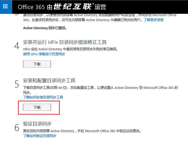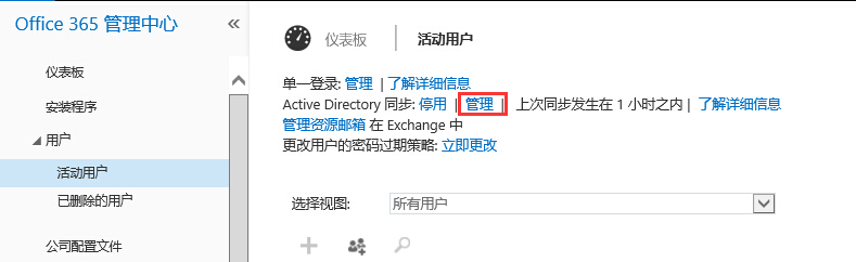 登录Office 365管理中心,点击用户–活动用户中仪表板中Active Directory 同步中的管理