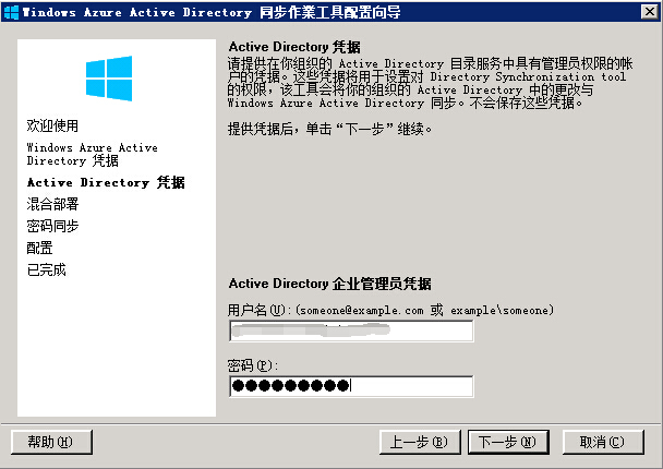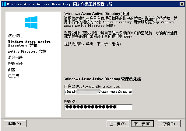打开目录同步工具首先需要输入O365管理员的账号及密码,然后点击下一步