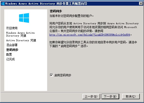 接下来我们不启用混合部署,在密码同步页面中勾选“启用密码同步”