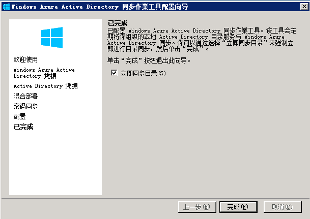 设置完成需要同步的OU后,重新开始进行目录同步,请参照以前的步骤,在最后页面中勾选“立即同步目录”