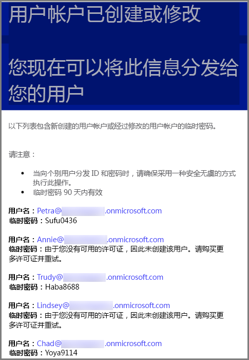 已将用户添加到 Office 365 之后,你需要告知这些用户其 Office 365 帐户信息。请使用正常的新密码通知流程。