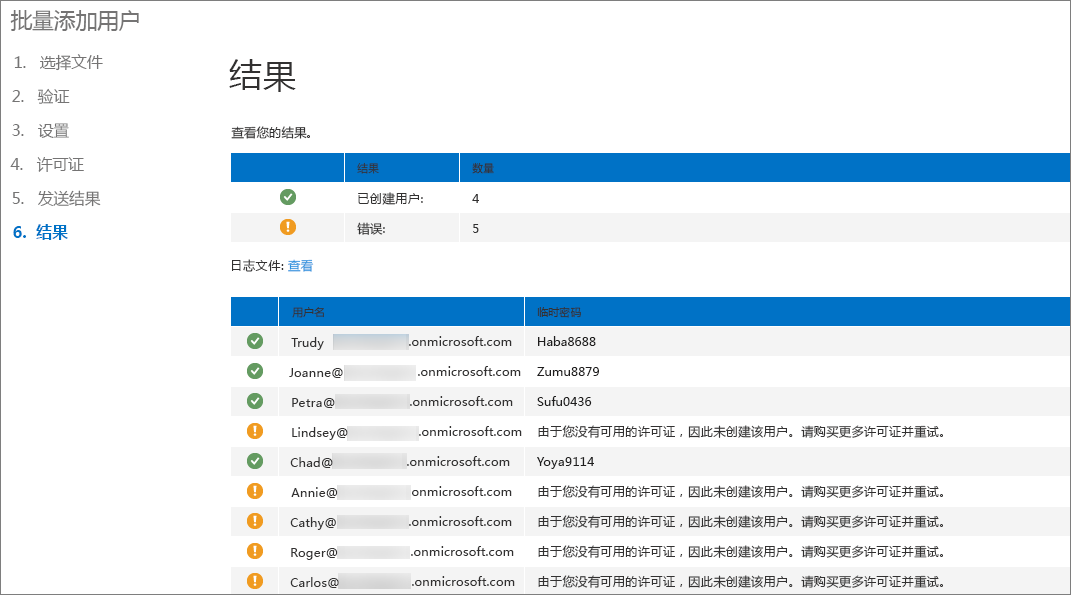 “批量添加用户”向导中的最后一页列出用户名和临时密码,如下图中所示。
