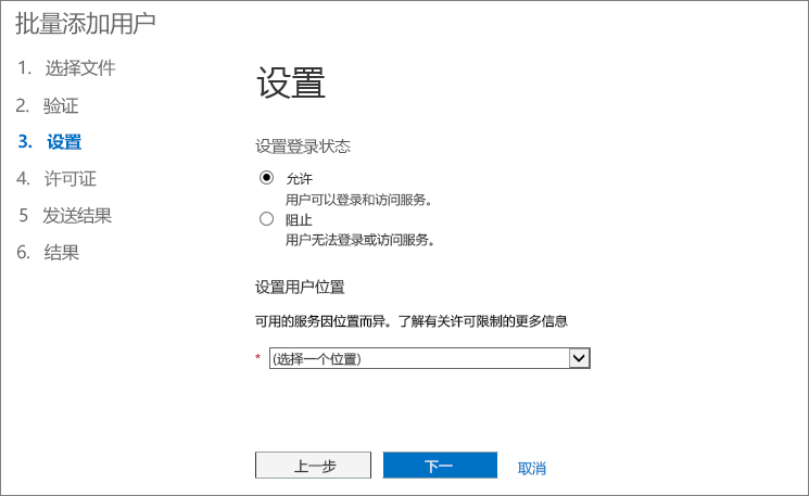 5、在“步骤 3 – 设置”中,选择“允许”,以便您的电子表格中列出的用户可以使用 Office 365。 也请选择这些用户使用 Office 365 时所在国家/地区。 请记住,如果组织中的某些用户要在其他国家/地区使用 Office 365,请使用这些用户的名称创建一个单独的电子表格,并再次运行“批量添加用户”向导以添加这些用户。