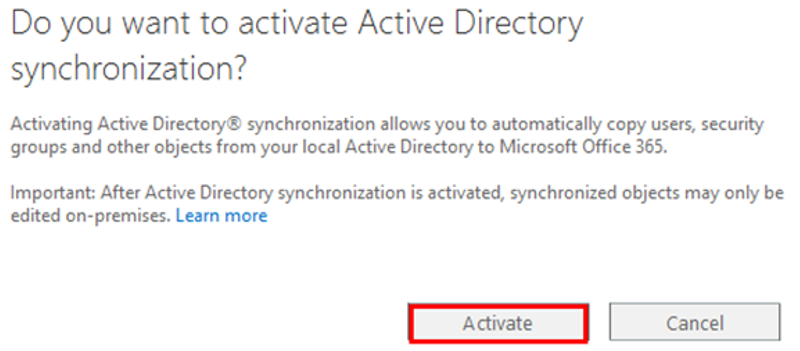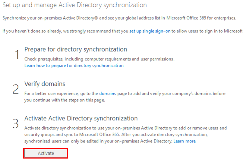 - 确认符合混合部署需求后,需要登录Office 365激活目录同步功能。