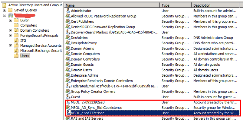 - 目录同步工具会在本地和AD内创建 MSOL_AD_SYNC 帐户并使用此帐户读取Active Directory 信息,移动或删除此帐户将导致同步失败。