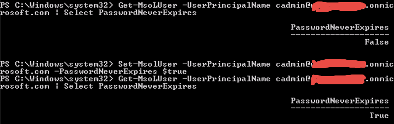 Get-MsoLUser -UserPrincipalName cadmin@xxx.onmicrosoft.com | Select PasswordNeverExpires