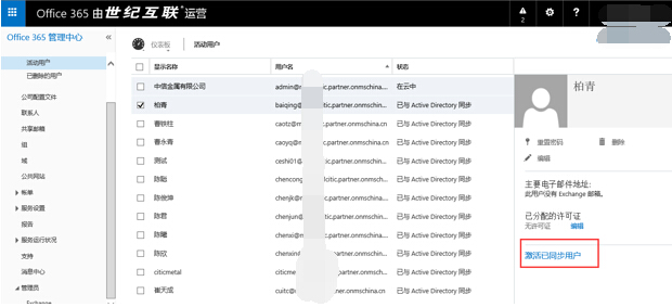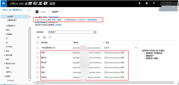 - 进入用户管理页面,可以查看到Active Directory同步已启用,用户已与Active Directory同步,说明目录同步已完成。