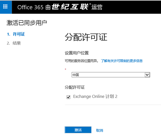 - 进入激活已同步用户页面,为用户设置地理位置为中国,分配许可证勾选Exchange Online计划2之后,点击激活。