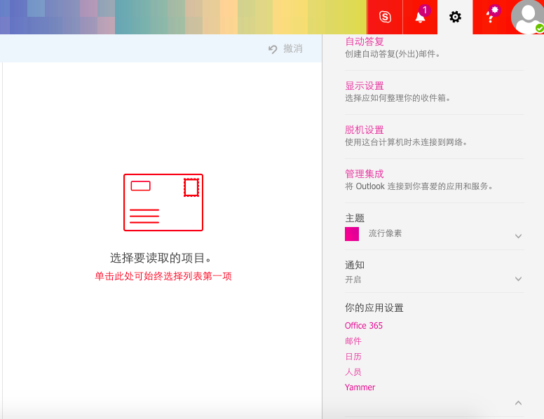 进入Office 365之后,进入Outlook模式,点击右上角用户头像左侧的齿轮,在打开的下拉菜单中,【你的应用设置】中,点击【office 365】: