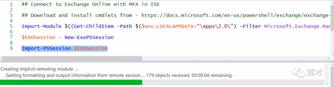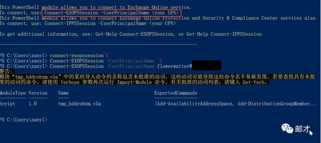 - 安装完成后,系统会开启一个PS窗口,根据提示,我们输入命令“connect-exopssession -userprincipalname <管理员帐户名>”即可连接到Exchange Online环境。
