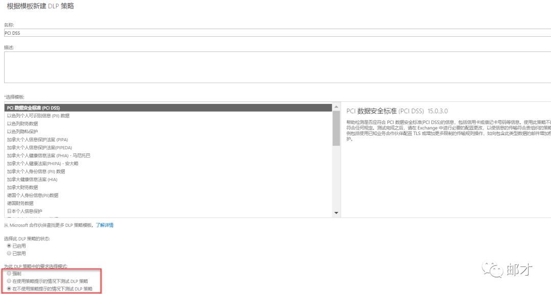 - 进入配置页面,我们可以看到茫茫多的模板,这里就不一一介绍了,相信右边的描述栏已经介绍得够详细了。这里想讲的是最下方的“DLP策略的要求选择模式”。