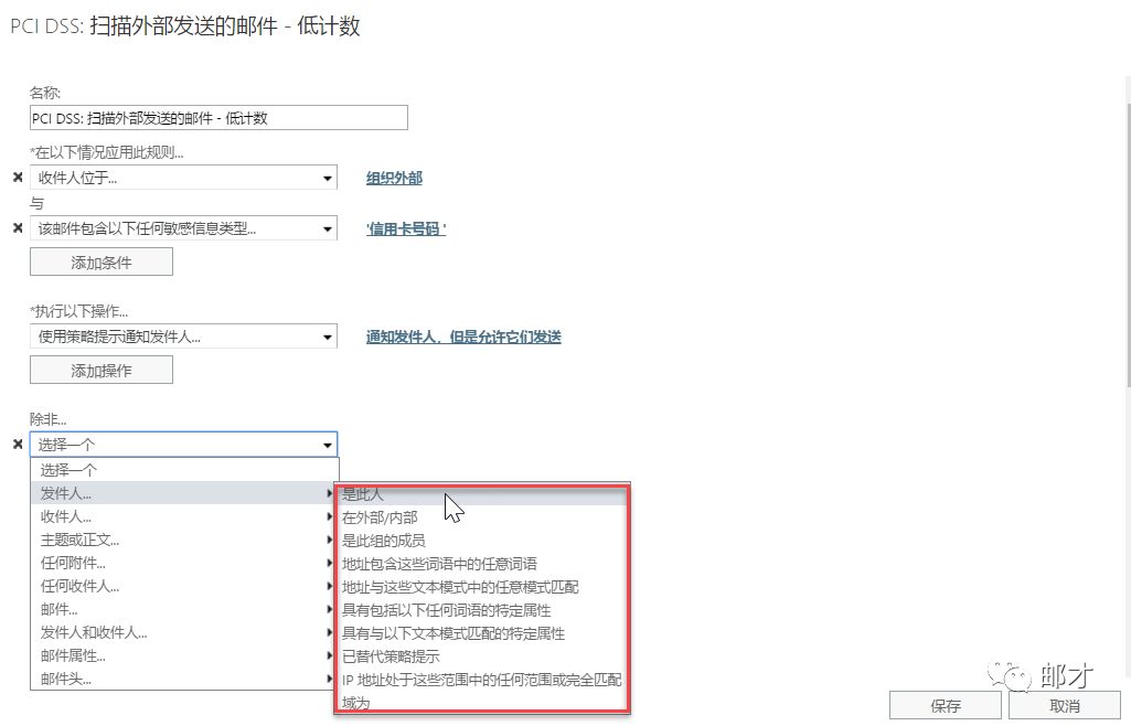 - 他首先定义了触发条件是收件人处于组织外部,以及包含敏感信息的类型;然后是触发操作,最后是例外情况。