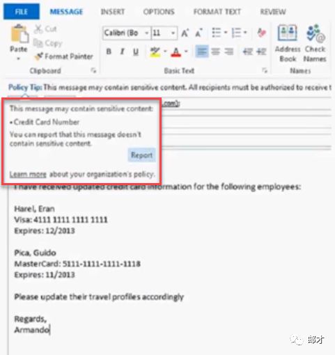 完成之后,当有用户匹配到信用卡低计数的DLP策略后,就会应用到对应的措施(默认是“通知发件人,但是允许它们发送”)