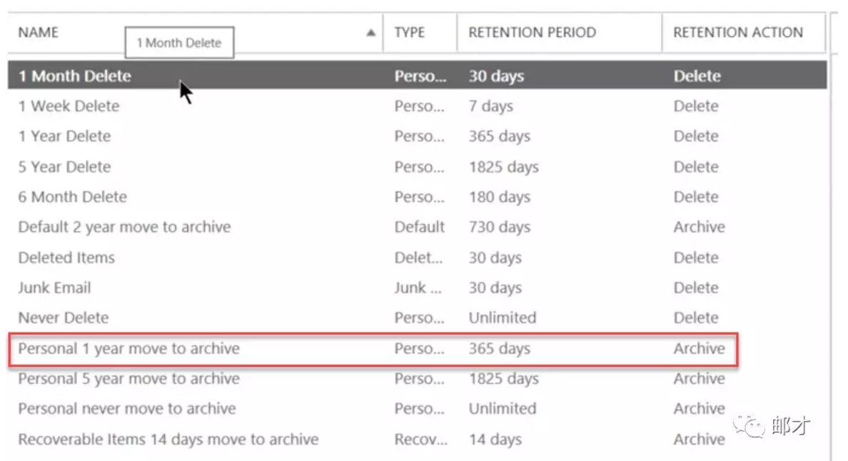 Exchange 2016(包括2013以及Exchange Online)默认已经有13个预定义的标记,从“一周后就删除”到“永远不归档”几乎涵盖了所有法律法规及企业定制化的需求。这里我们选择一年后归档这个标记。