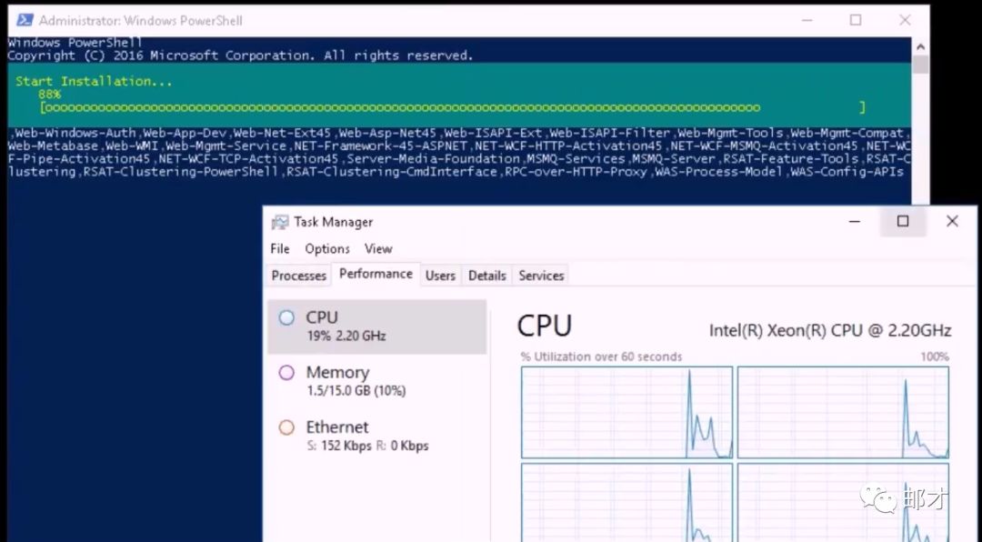 操作系统是Windows Server 2016,整个Windows组件的安装过程不太占用计算资源。组件列表与Exchange2016基本一致。
