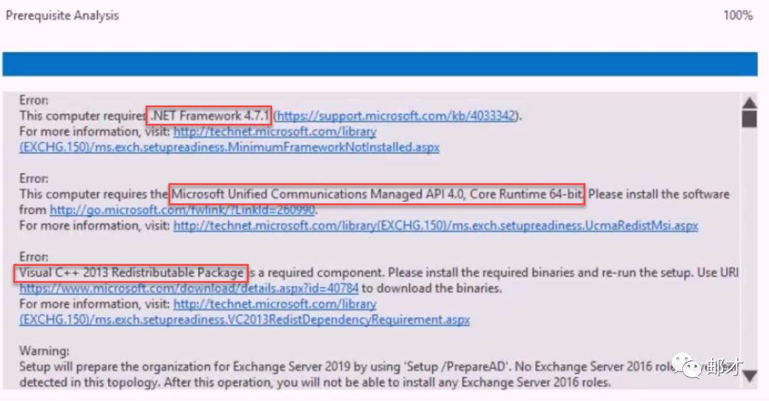 系统组件扩展完成后,还需要安装三个功能性组件,分别是.Net Framework 4.7.1(Exchange 2016为.NetFramework 4.6);UCMA4.0(与Exchange2013,2016相同);Visual C++ 2013再发行版包(新组件)。