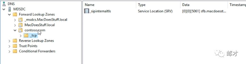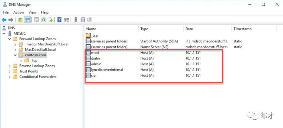 由于我们创建的SfB的SIP后缀与我们的域名和邮箱后缀都不一样,我们需要在内部DNS中新建一个主要区域后,再把dialin和meet的A记录创建出来。