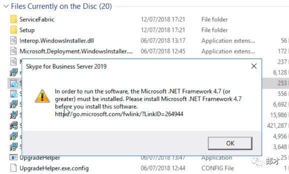 SfB2019的安装需要.Net4.7的环境,因此我们还需要联机安装.Net Framework 4.7或使用离线安装包,不然安装程序会报错。
