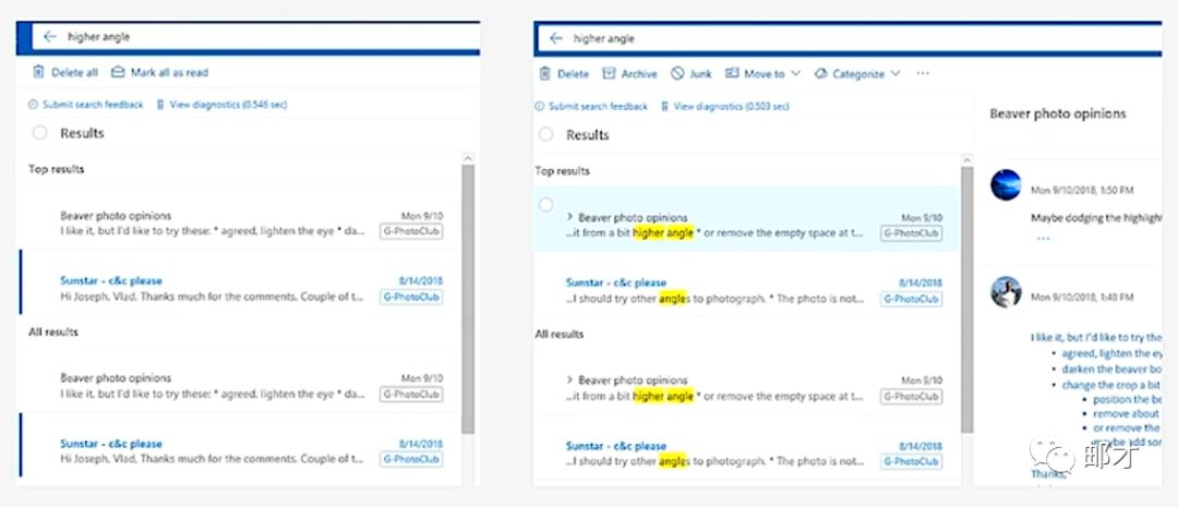 支持如此巨量请求的幕后功臣是基于全闪存存储的BigFunnel技术,Exchange 2019将这个技术移植到了本地化邮件系统中,他对搜索结果有以下两个直接的影响: