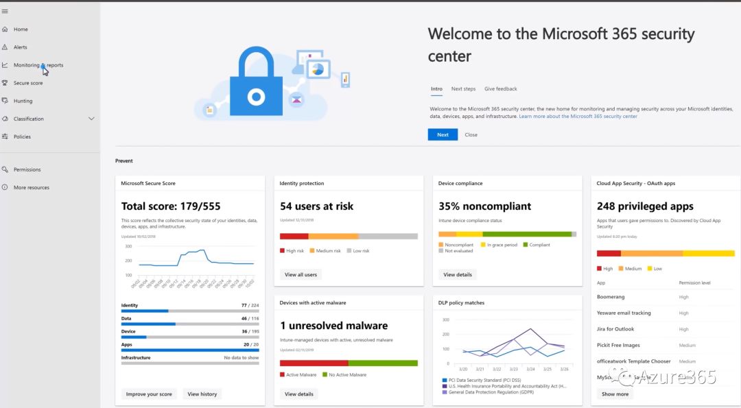 接下来一些零星的功能例如网页版Outlook通过人工智能(同样是基于Azure的认知服务)将用户相关的sharepoint文件、邮件往来设置自动代办项并自动更新;跨平台多客户端的实时视频会议(支持Yammer、Stream和Teams用户同时拨入);Microsoft Forms和Streams的集成;M365安全中心的新界面这里就不一一赘述了。