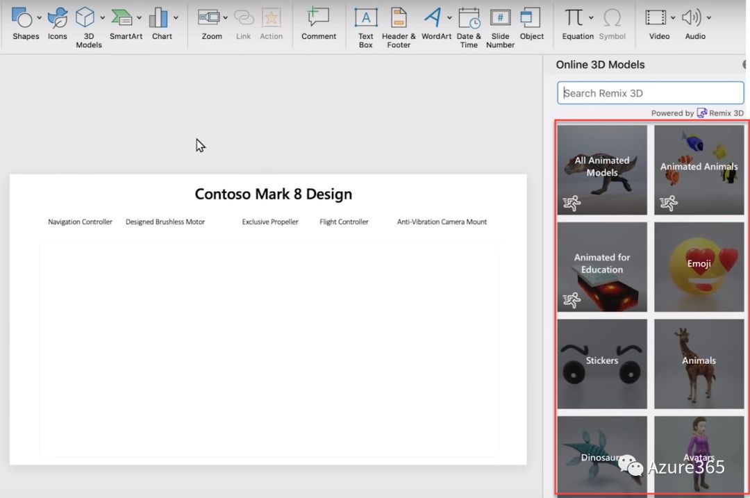 下一项功能是对视觉系办公人员们的福音,新的Office365套件中支持了对Powerpoint,Word和Excel中3D模型的播放支持,通过微软商店可以直接获取所有免费的3D动画模型,也可以付费获取一些更精致的模型。