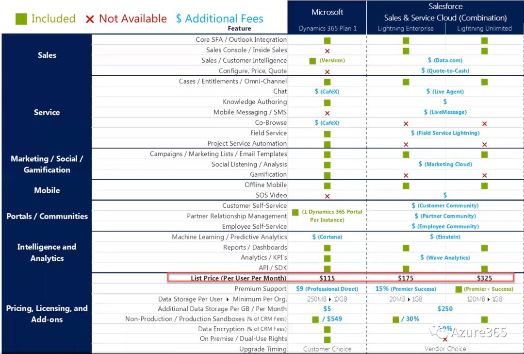 计价方面D365的总持有成本(TCO)更低,并且价格相当透明,并且可根据单个用户的角色申请不同的许可证(License),同时CRM的Portal、销售智能、BI、社群、销售机会积分功能都是免费的增值服务,最后API查询没有限制;而Salesforce这部分首先TCO和订阅价格更高,许可证也没有D365那样的粒度,作为增值的沙盒、数据存储和数据加密都是收费的功能,API调用,邮件及查询都有数量限制。两者的基础报价和功能可参见下表。