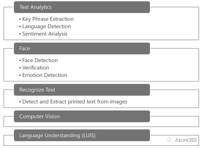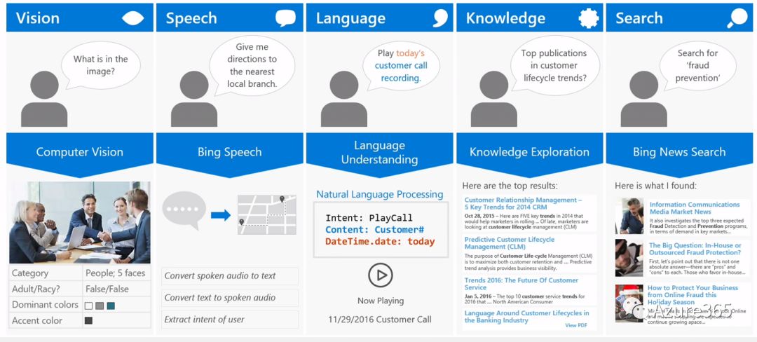 AI认知服务可以分为视觉、语音、语言、搜索和知识体系五个大类共28个小类的认知能力。