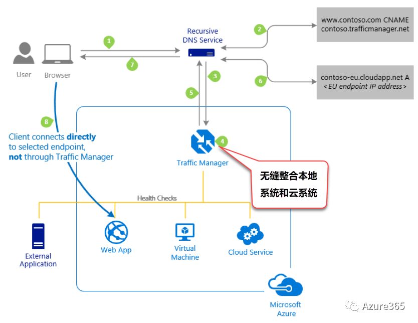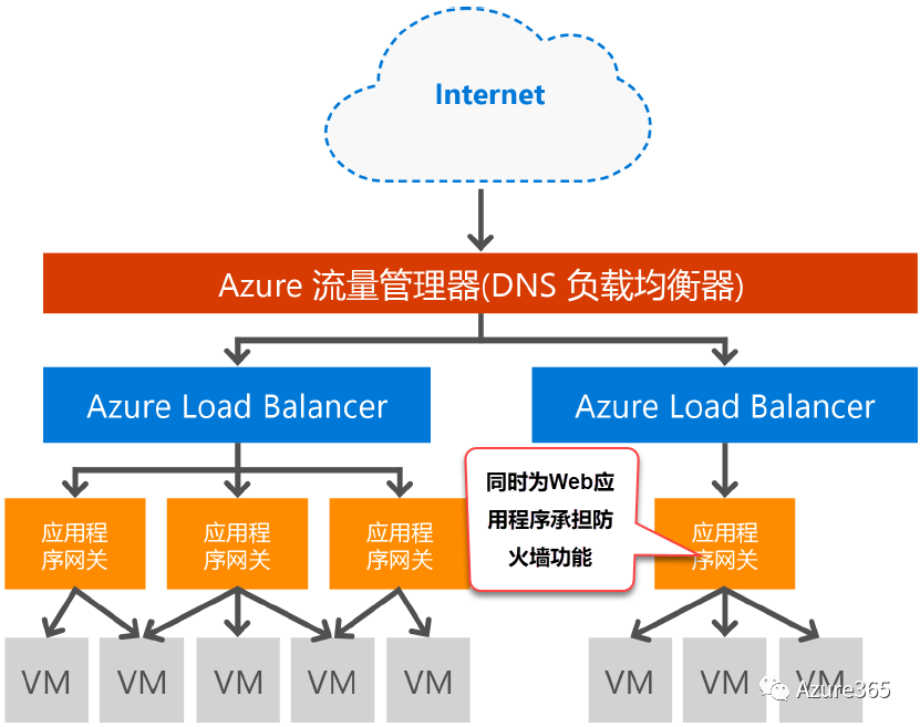 至于上图负载均衡器前端的流量管理器可以将用户流量分布到多个物理站点位置以减少因为地域原因造成的应用停机时间,也可与本地数据中心配合使用,定义访问策略改进应用程序可用性(等量分配或加权分配访问流量),也可针对新部署进行A/B测试。