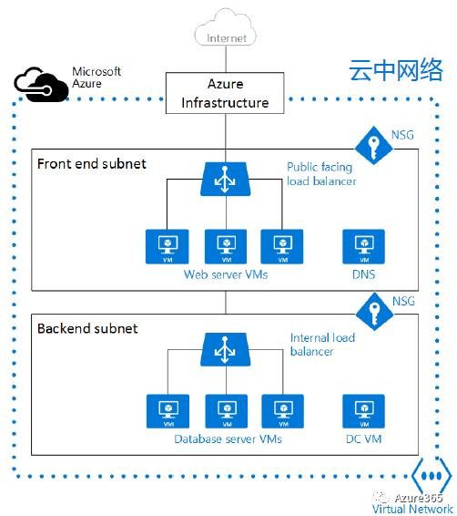 今天介绍的网络部分从本地网络去理解Azure的话,可以把前端子网(Front End Subnet)看成是本地网络中的DMZ,后端子网(Backend Subnet)看成是本地网络中的内网。