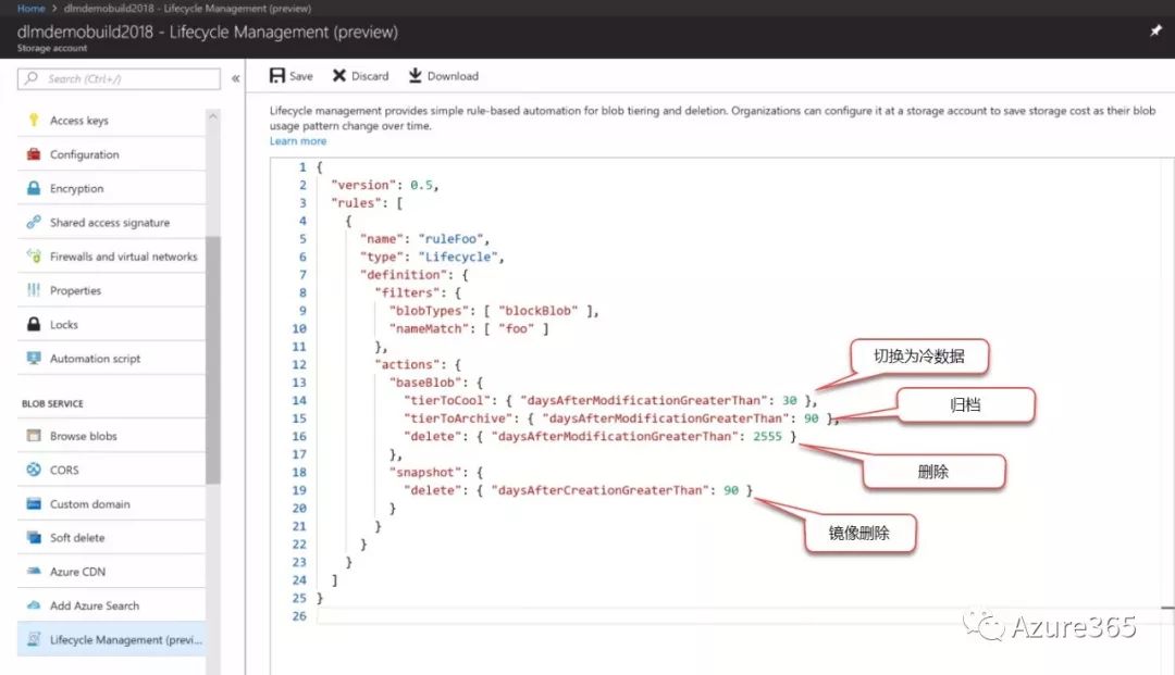 Azure Blob的配置界面提供了图形结合脚本编程的干预方式,例如在生命周期管理界面,通过简单的YAML文件可以自动定义入站数据的生命周期管理。包括什么时候切换为“冷数据”状态、什么时候归档、什么时候删除、什么时候删除镜像等等。