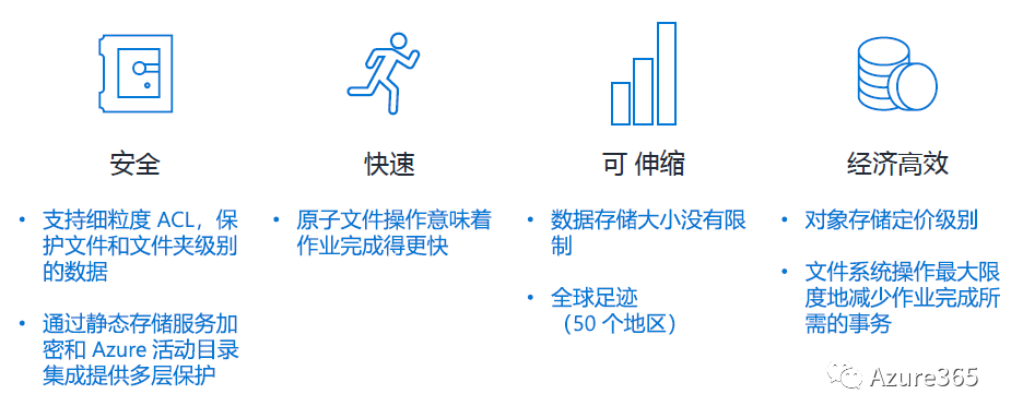 - 完全支持所有Blob功能(AAD集成、区域冗余和RA–Geo冗余存储);